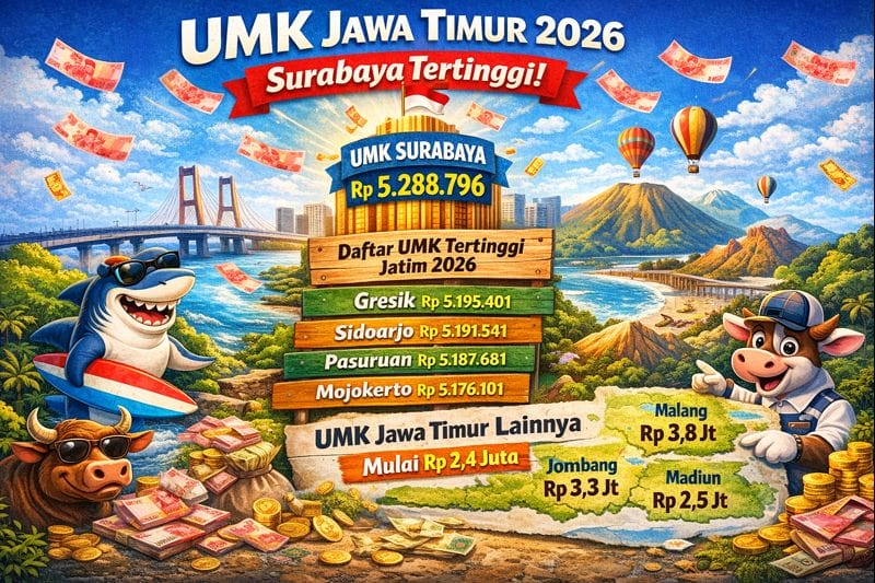 Gaji UMR untuk Kota dan Kabupaten di Jawa Timur Tahun 2026 resmi ditetapkan — dan seperti tahun-tahun sebelumnya, Surabaya kembali menjadi kota dengan UMK tertinggi di Jawa Timur.